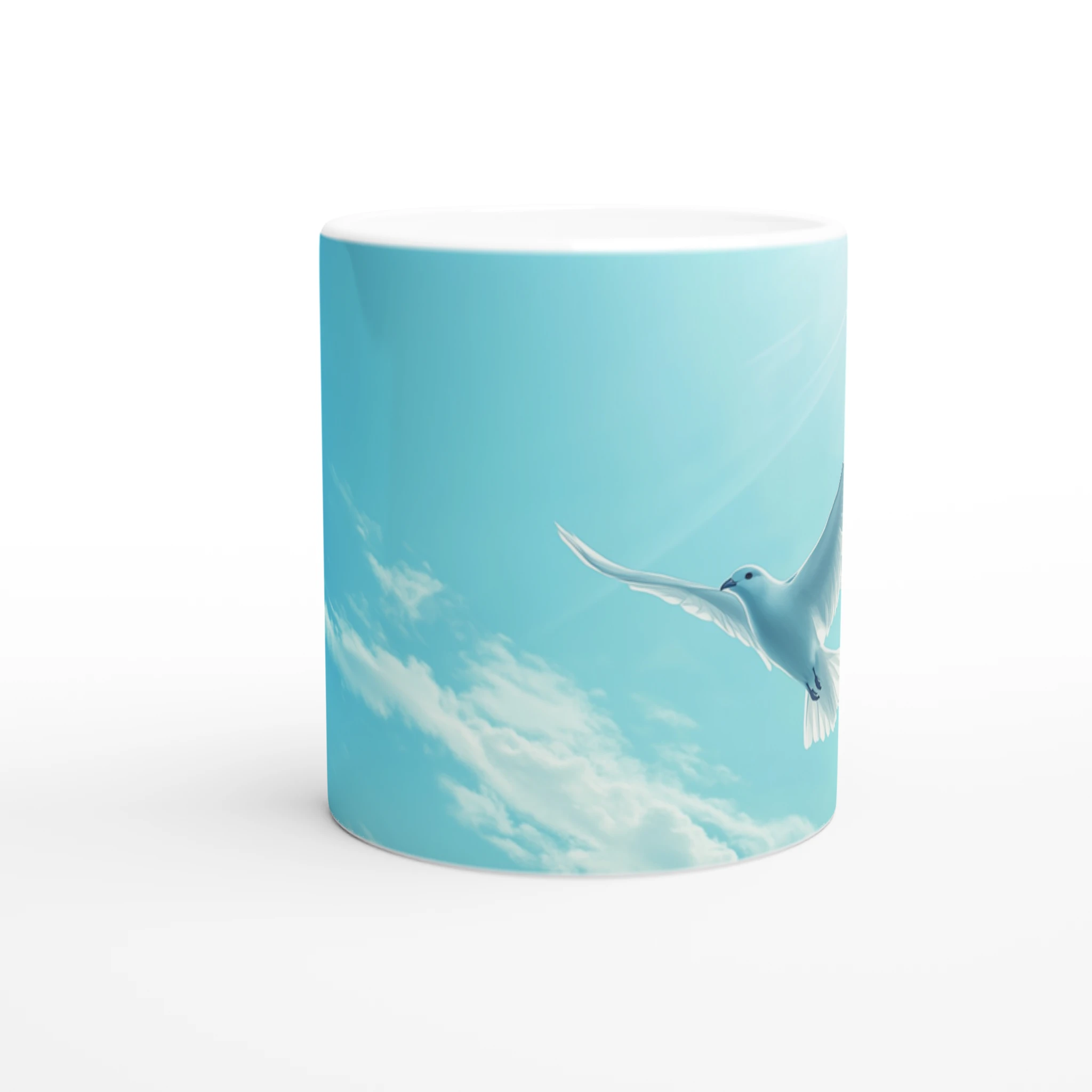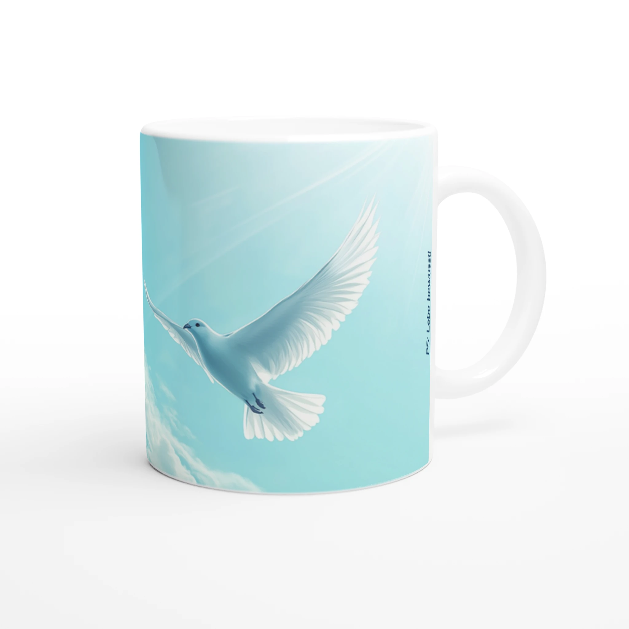 Weiße Tassenfarbe passt perfekt zu diesem Bild, da sie Reinheit, Klarheit und Freiheit symbolisiert und die Leichtigkeit des Vogels und des Himmels widerspiegelt.